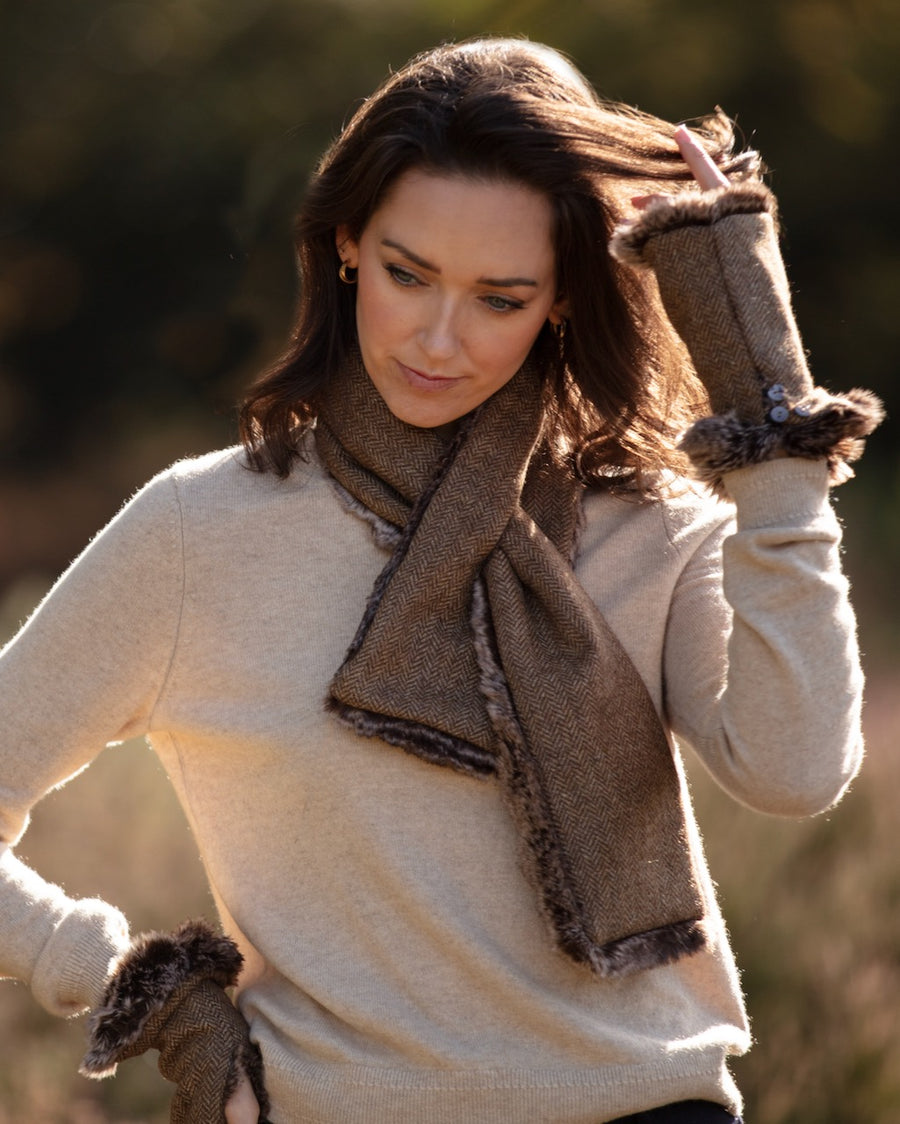 Wrap yourself in warmth and timeless style with our luxuriously soft tweed and faux fur scarf — made in the UK from beautifully woven British Shetland wool. This elegant winter scarf is lined in plush faux fur for unbeatable cosiness...